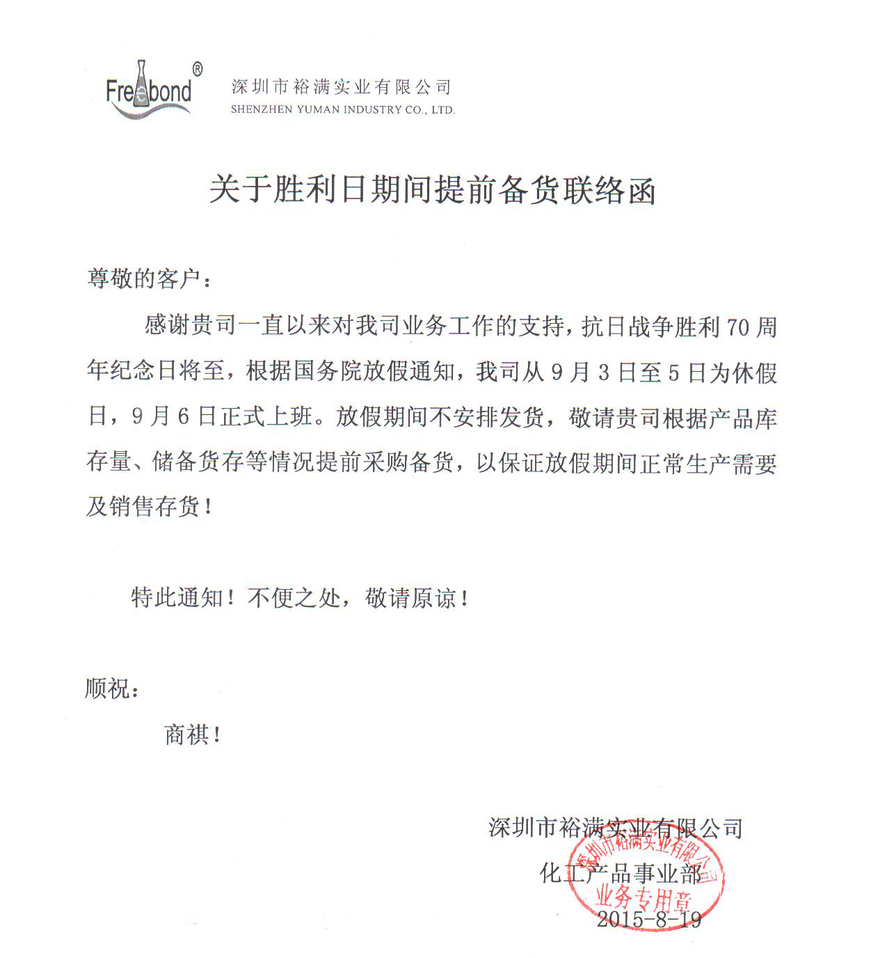 感謝貴司一直以來對我司業務工作的支持。勝利紀念日假期将至, 根據國務院關於(yú)中國人民抗日戰争暨世界反法西斯戰争勝利70周年紀念日調休放假的通知,我司從2015年9月3日至9月5日爲休假日,共3天,6日正式上班。煩敬請貴司根據産品庫存量、儲備貨存等情況提前做出採(cǎi)購備貨,以保證放假期間正常生産需要及銷售存貨!