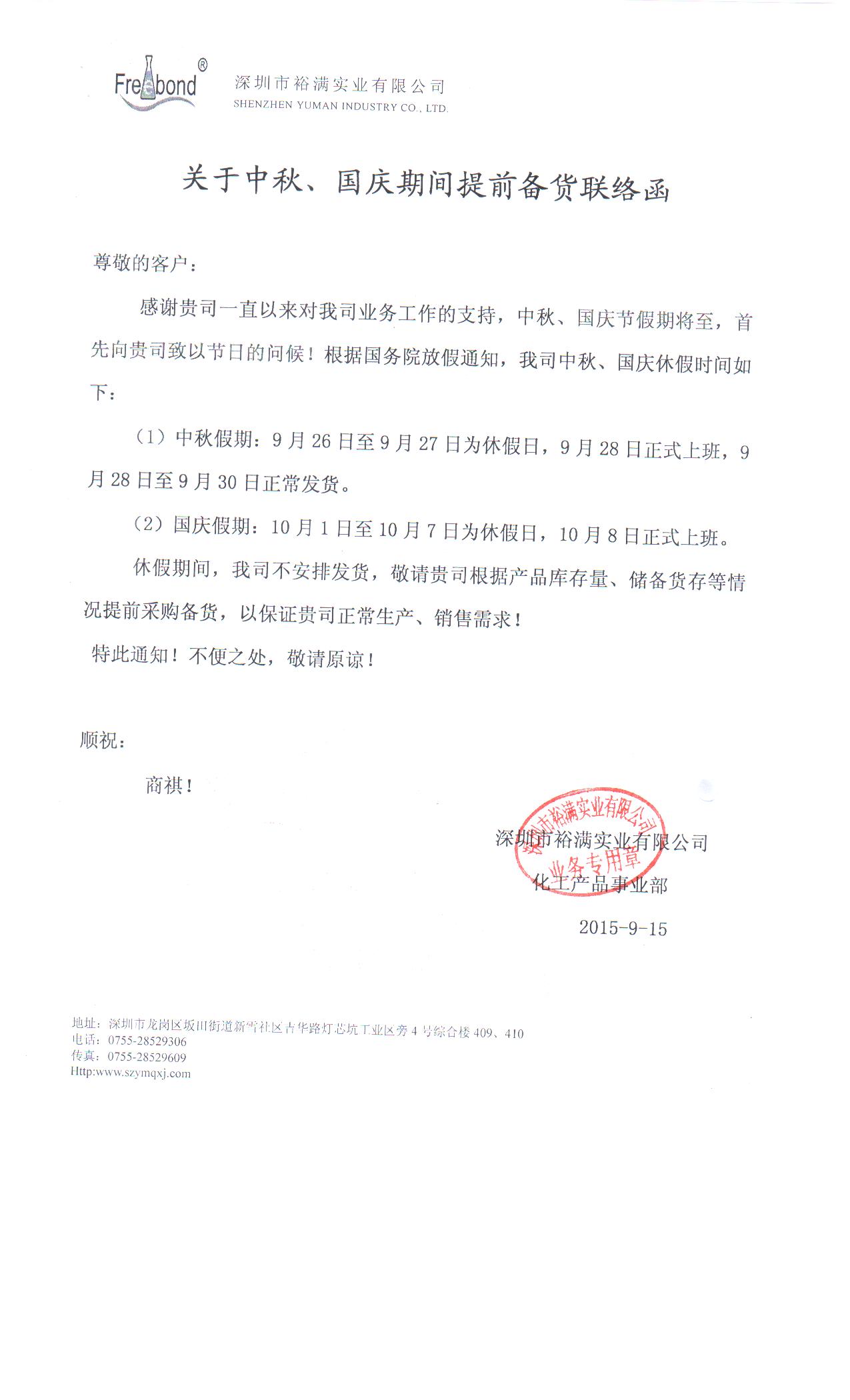 關於中秋、國慶期間提前備貨聯絡函