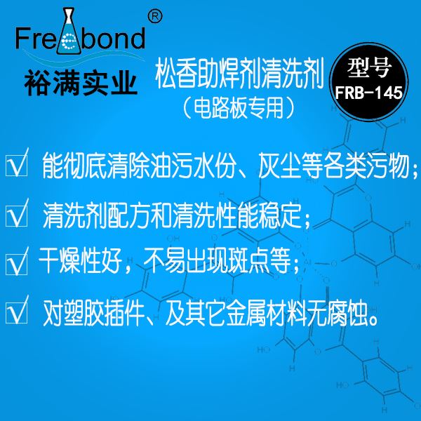 快幹無鉛助焊劑清洗劑|快幹無鉛松香清洗劑|裕滿清洗劑FRB-145是一款用於(yú)清洗精密電路闆和電子元件表面松香、助焊劑、油污、塵(chén)埃等各類污物的無鉛清洗劑,本品具有安全、無鉛、清洗力強、性能穩定、無腐蝕、成本低等優點。