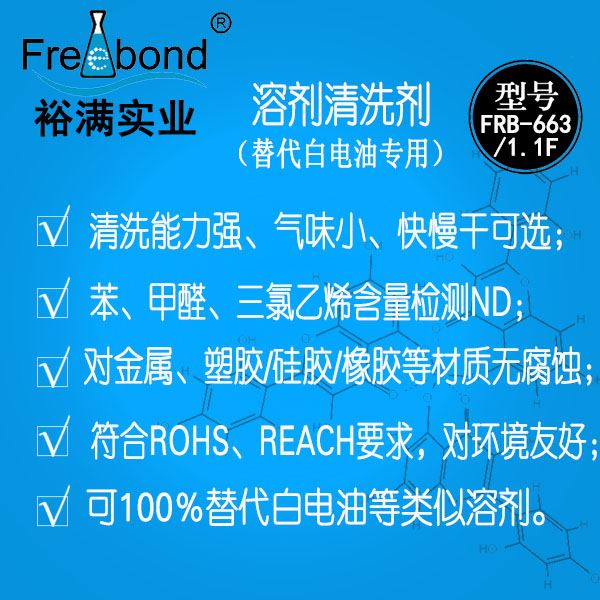 快幹溶劑清洗劑|快揮發溶劑清洗劑|裕滿清洗劑FRB-663/FRB-1.1F是一種用於(yú)替代白電(diàn)油等正己烷類溶劑的環保清洗劑;本品不僅具有正己烷類溶劑良好的清洗力,還可降低職工正己烷等化學品急性和慢性中毒危害。