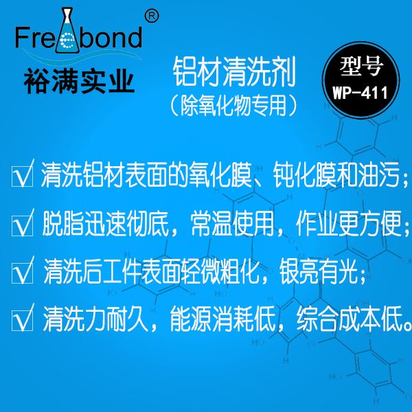 鋁材光亮清洗劑|鋁合金光亮清洗劑|裕滿清洗劑WP-411是一款以表面活性劑爲主要成份,用於(yú)鋁材(純鋁、鋁合金)表面清洗氧化膜、鈍化膜、油污的清洗劑;本品适合於(yú)鋁合金堿蝕處(chù)理,氧化膜處(chù)理及塗裝前處(chù)理等工藝使用。