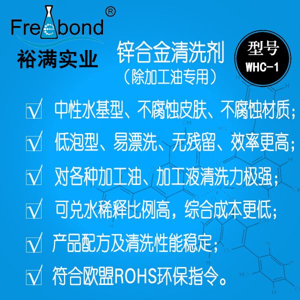中性鋅合金清洗劑|中性鋅合金脫脂除油劑|裕滿清洗劑WHC-1是一款以表面活性劑爲主要成份的水基清洗劑;本品能夠徹(chè)底的清除工件表面的各種加工油、加工液等髒污,具有清洗力強、性能穩定、低泡型易漂洗、綜合成本低、不腐蝕材質等優點(diǎn)。