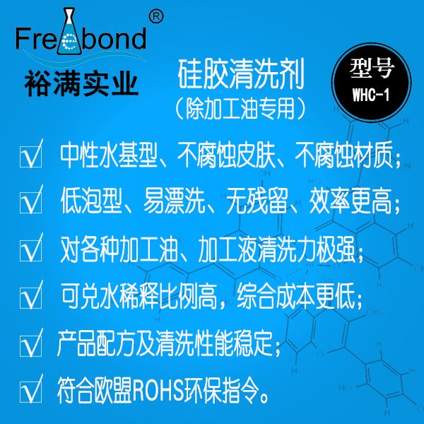 中性矽膠清洗劑|中性矽膠脫脂除油劑|裕滿清洗劑WHC-1是一款以表面活性劑爲主要成份的水基清洗劑;本品能夠徹(chè)底的清除工件表面的各種加工油、加工液等髒污,具有清洗力強、性能穩定、低泡型易漂洗、綜合成本低、不腐蝕材質等優點(diǎn)。