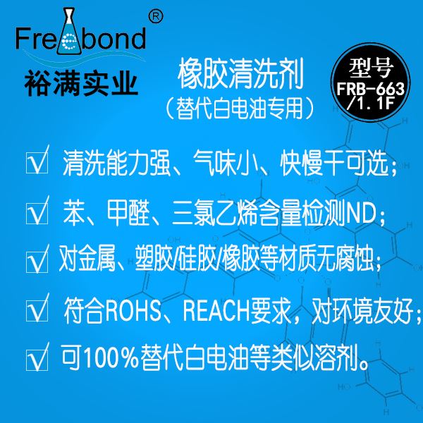 橡膠擦拭清洗劑|橡膠表面擦拭清洗劑|裕滿清洗劑FRB-663/FRB-1.1F是一種用於(yú)替代白電(diàn)油等正己烷類溶劑的環保清洗劑;本品不僅具有正己烷類溶劑良好的清洗力,還可降低職工正己烷等化學品急性和慢性中毒危害。