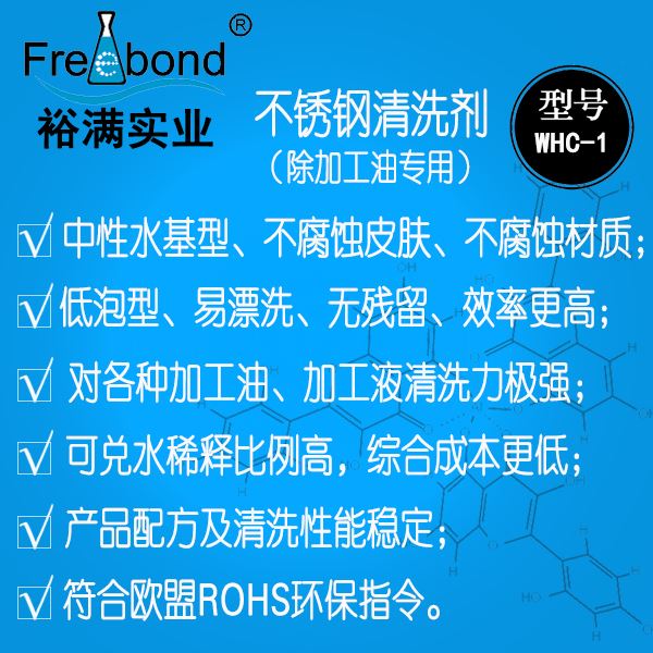 中性不鏽鋼清洗劑|中性不鏽鋼脫脂除油劑|裕滿清洗劑WHC-1是一款以表面活性劑爲主要成份的水基清洗劑;本品能夠徹底的清除工件表面的各種加工油、加工液等髒污,具有清洗力強、性能穩定、低泡型易漂洗、綜合成本低、不腐蝕材質等優點。