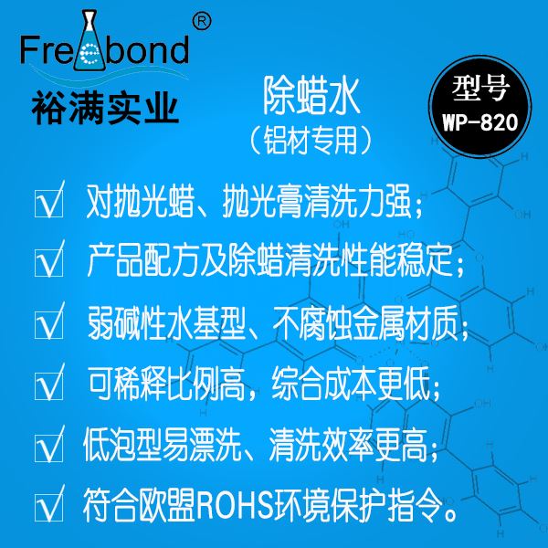 水基鋁材除蠟水|水基鋁材除臘水|水性鋁材除臘劑|裕滿清洗劑WP-820是一款以表面活性劑爲主要成分的除蠟清洗劑,适用於(yú)各類金屬工件的表面抛光蠟和抛光膏的清洗;本品具有除蠟清洗力強、性能穩定、低泡型易漂洗、綜合成本低、不腐蝕材質且能保持抛光面原有的光澤等優點(diǎn)。