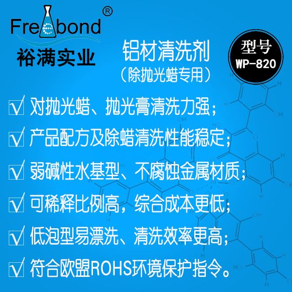 水基鋁材除蠟水|水基鋁材除臘水|水性鋁材除臘劑|裕滿清洗劑WP-820是一款以表面活性劑爲主要成分的除蠟清洗劑,适用於(yú)各類金屬工件的表面抛光蠟和抛光膏的清洗;本品具有除蠟清洗力強、性能穩定、低泡型易漂洗、綜合成本低、不腐蝕材質且能保持抛光面原有的光澤等優點(diǎn)。